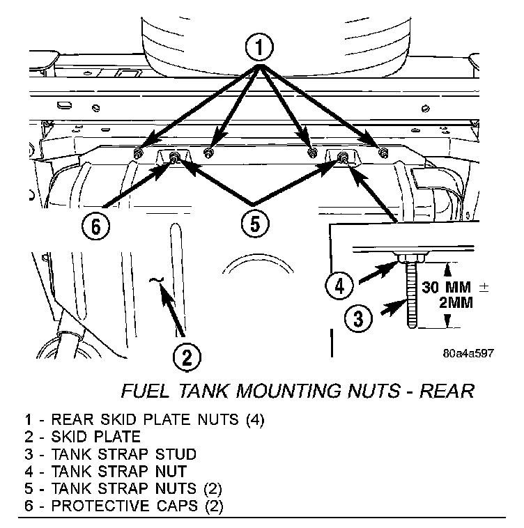 23. To separate tank from skid plate, remove two protective caps (6) at tank strap studs and remove tank strap nuts.