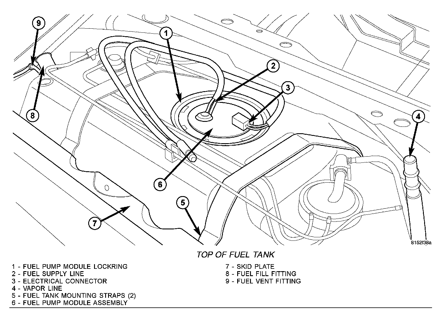 5. Raise skid plate/fuel tank assembly into position on body while carefully guiding plastic vapor lines and fill hose.