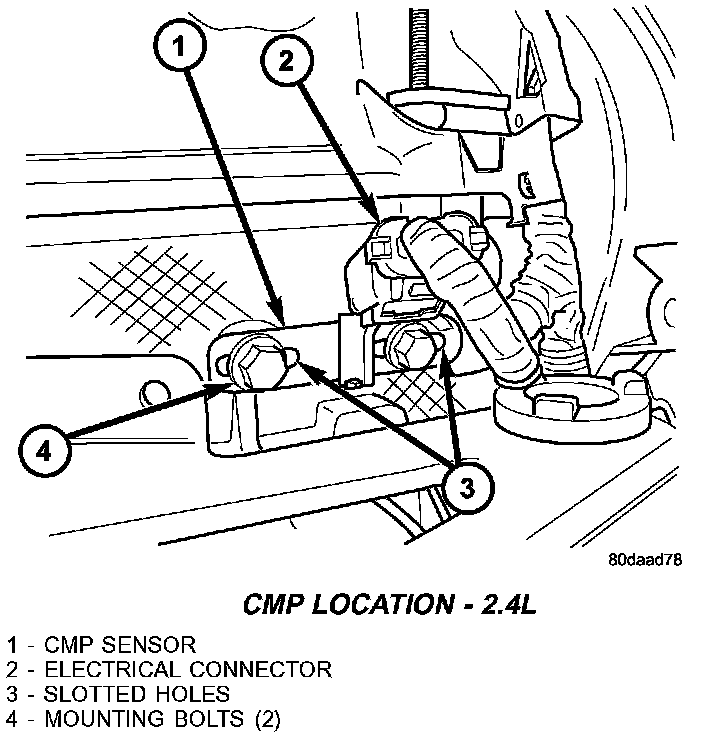 The Camshaft Position Sensor (CMP) on the 2.4L 4 cylinder engine is bolted to the right-front side of the cylinder head. Sensor position (depth) is adjustable.