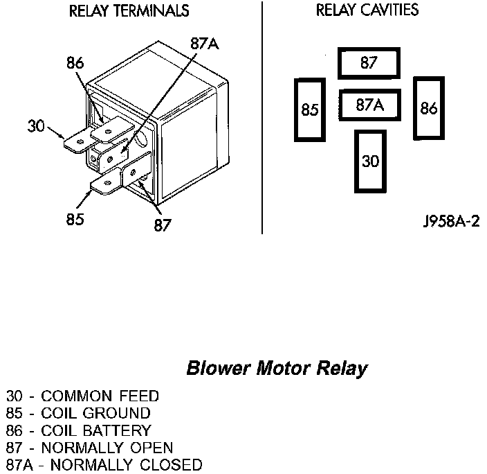 - The normally closed terminal (87A) is not connected to any circuit in this application, but provides a battery current output only when the blower motor relay coil is de-energize