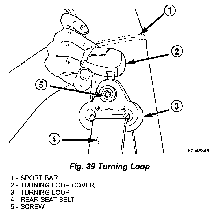 5. Unsnap and lift the trim cover from the rear seat belt turning loop to access the screw that secures the turning loop to the upper sport bar.