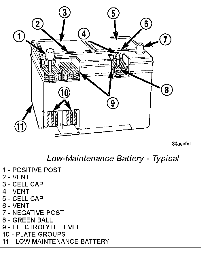The factory-installed battery has a built-in test indicator (hydrometer). The color visible in the sight glass of the indicator will reveal the battery condition. Refer to Standard Procedures for the proper built-in indicator test procedures. The factory-installed low-maintenance battery has removable battery cell caps. Water can be added to this battery. The battery is not sealed and has vent holes in the cell caps. The chemical composition of the metal coated plates within the low-maintenance battery reduces battery gassing and water loss, at normal charge and discharge rates. Therefore, the battery should not require additional water in normal service. If the electrolyte level in this battery does become low, water must be added. However, rapid loss of electrolyte can be caused by an overcharging condition. Be certain to diagnose the charging system after replenishing the water in the battery for a low electrolyte condition and before returning the vehicle to service.