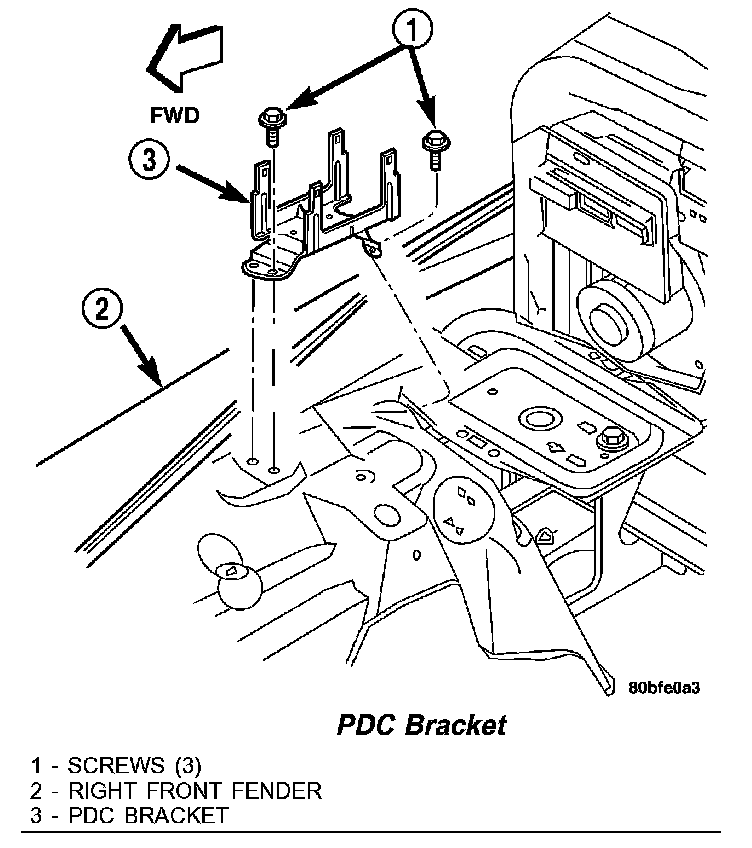 3. Remove the three screws that secure the PDC bracket to the right front inner fender.