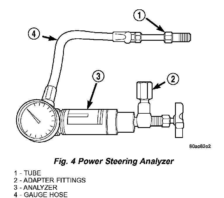 DIAGNOSIS AND TESTING - POWER STEERING FLOW AND PRESSUREThe following procedure is used to test the operation of the power steering system on the vehicle. This test will provide the Gallons Per Minute (GPM) or flow rate of the power steering pump along with the maximum relief pressure. Perform test any time a power steering system problem is present. This test will determine if the power steering pump or power steering gear is not functioning properly. The following pressure and flow test is performed using Power Steering Analyzer Tool 6815 and Adapter kit 6893.