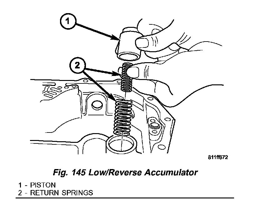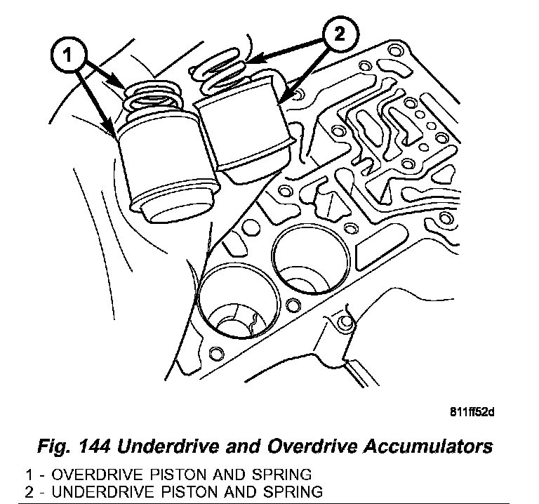 The 42RLE underdrive, overdrive, low/reverse, and 2/4 clutch hydraulic circuits each contain an accumulator. An accumulator typically consists of a piston, return spring(s), and a cover or plug. The overdrive (1) and underdrive (2) accumulators are located within the transmission case, and are retained by the valve body (Fig. 144).