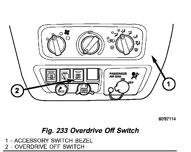 The overdrive OFF (control) switch is located in the center console (Fig. 233). The switch is a momentary contact device that signals the PCM to toggle current status of the overdrive function.