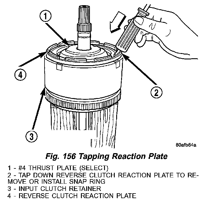 2. Tap down (2) reverse clutch reaction plate (4) to release pressure from snap ring (Fig. 156).