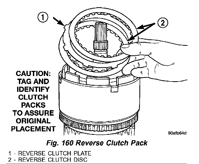 6. Remove the reverse clutch pack (two fibers/one steel) (1, 2) (Fig. 160).