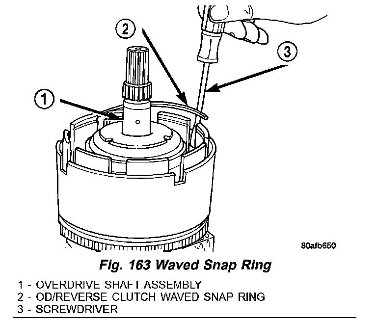 9. Remove OD/Reverse reaction plate wave snap ring (2) (Fig. 163).