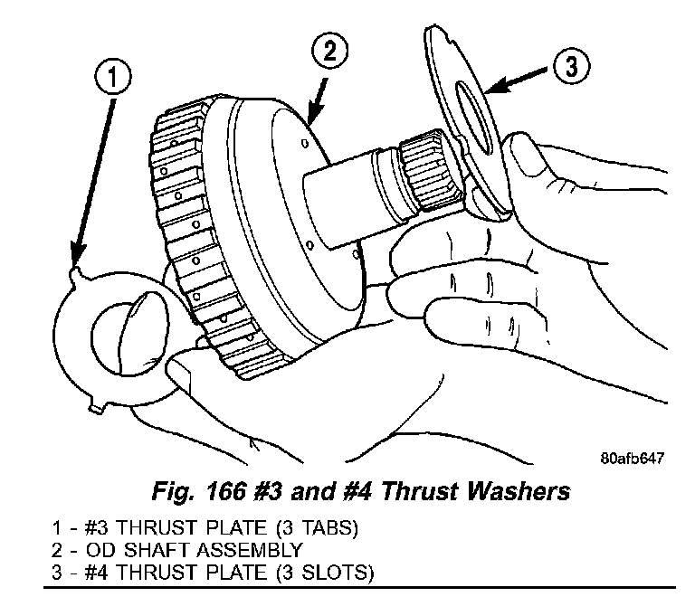 12. Remove and inspect number 3 and 4 thrust plates (1, 3) (Fig. 166).