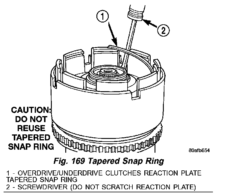 15. Remove the OD/UD reaction plate tapered snap ring (1) (Fig. 169).