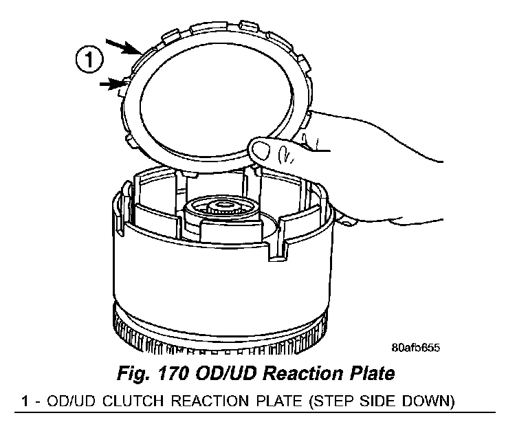 NOTE: The OD/UD clutch reaction plate has a step on both sides. The OD/UD clutches reaction plate goes tapered step side up.