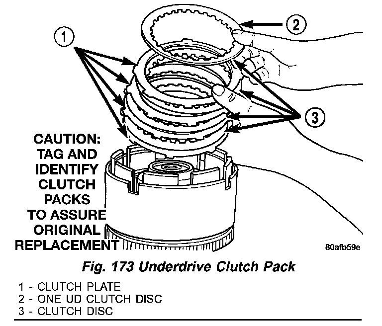 19. Remove the UD clutch pack (1, 3) (Fig. 173).
