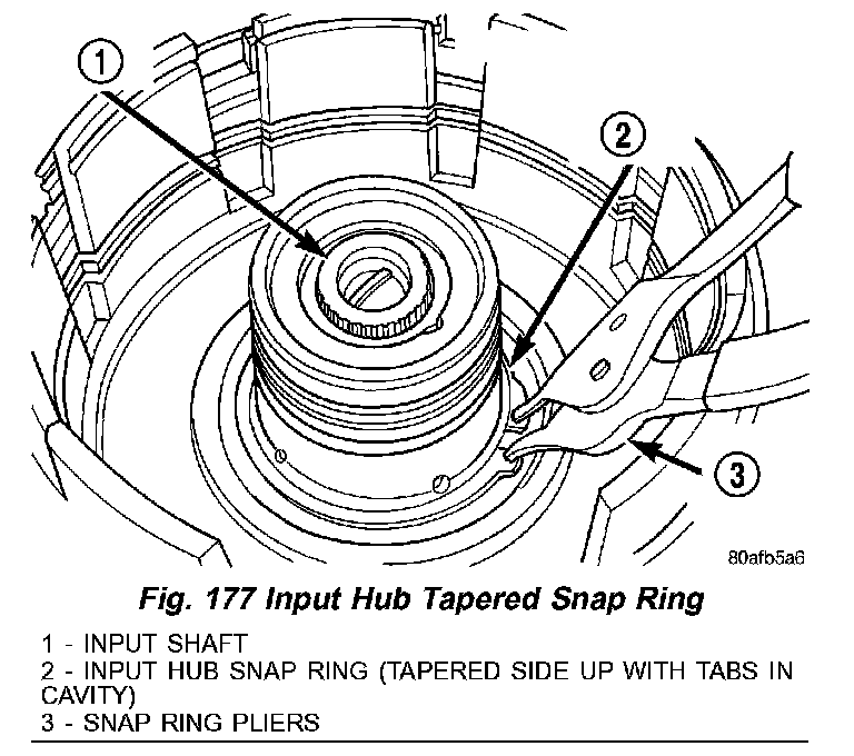 23. Remove the input hub tapered snap ring (2) (Fig. 177).