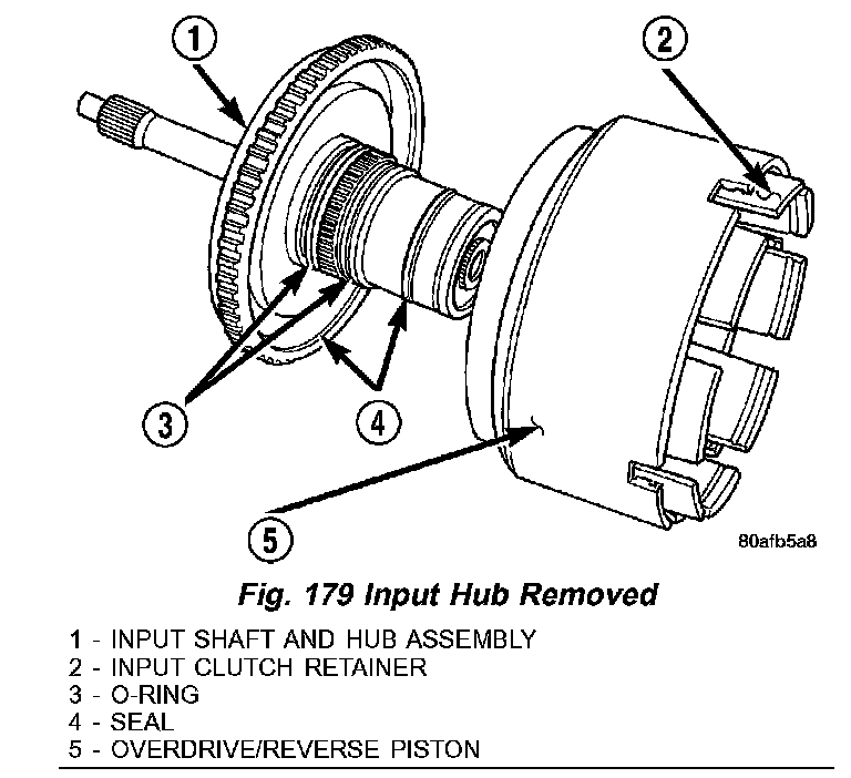 25. Separate the input hub from OD/Reverse piston (5) and clutch retainer (2) (Fig. 179).