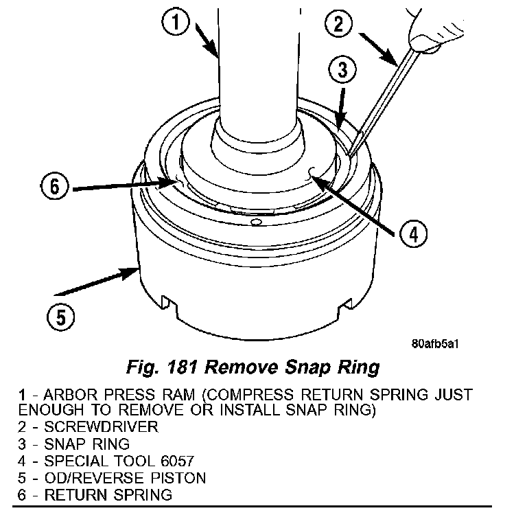 27. Using Tool 6057 (4) and an arbor press (1), compress OD/Reverse piston (5) return spring just enough to remove snap ring (3) (Fig. 181).