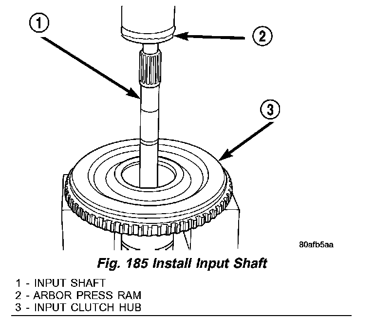 1. Using an arbor press(2), install input shaft (1) to input shaft hub (2) (Fig. 185).