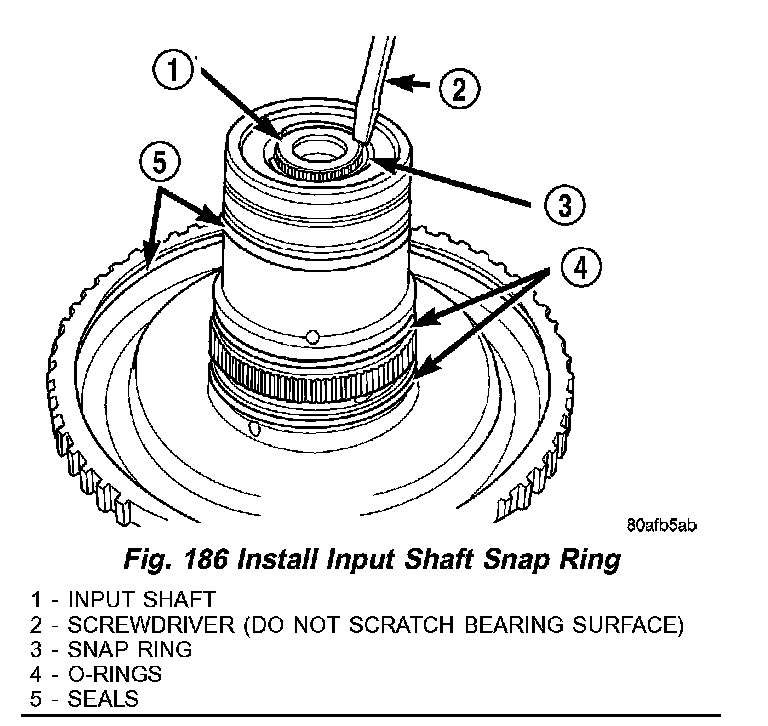 NOTE: Snap ring ends must be located within one finger of the input clutch hub. Be sure that snap ring is fully seated, by pushing with screwdriver, into snap ring groove all the way around.