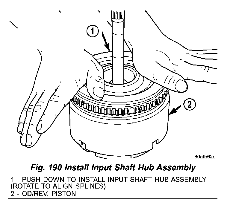 6. Install the input hub/shaft assembly (1) to the OD/Reverse piston/clutch retainer assembly (2) (Fig. 190).
