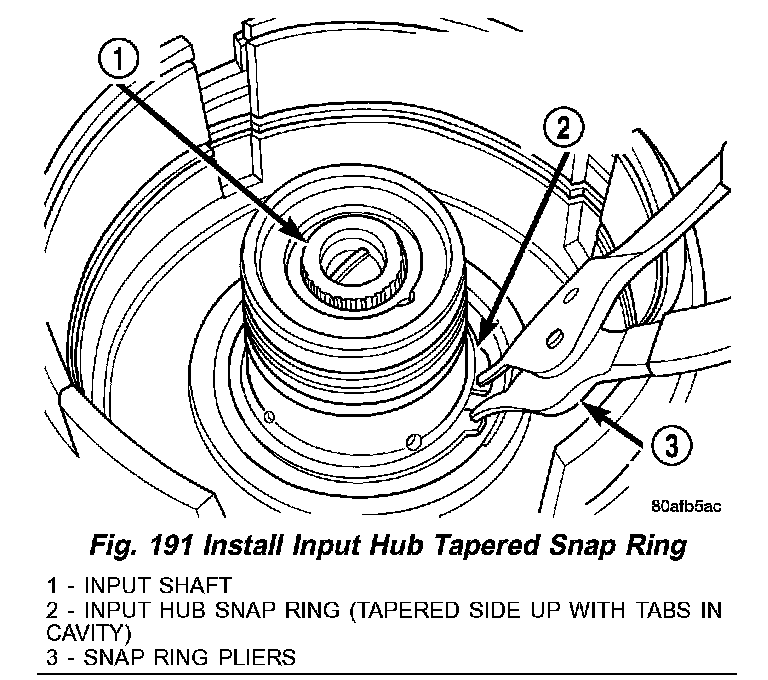 7. Install input hub tapered snap ring (2) (Fig. 191). Make sure snap ring is fully seated.