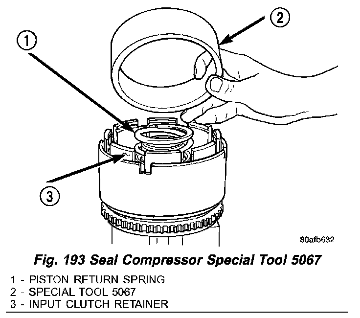 9. Install UD piston return spring (1) and Tool 5067 (2) (Fig. 193).