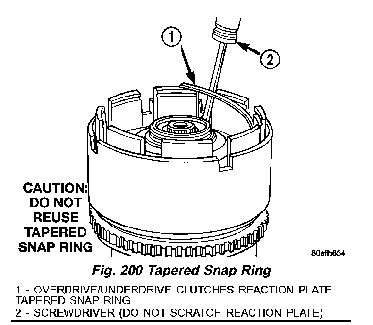 16. Install the MOD tapered snap ring (1) (Fig. 200).