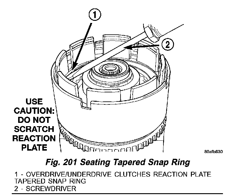 17. Seat tapered snap ring (1) to ensure proper installation (Fig. 201).