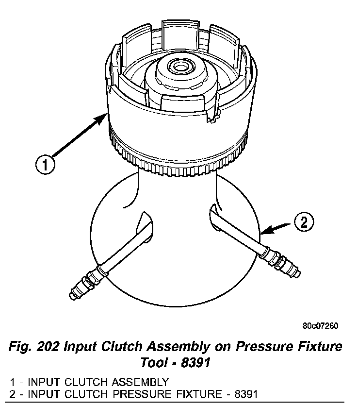 18. Install input clutch assembly (1) to the Input Clutch Pressure Fixture 8391 (2) (Fig. 202).