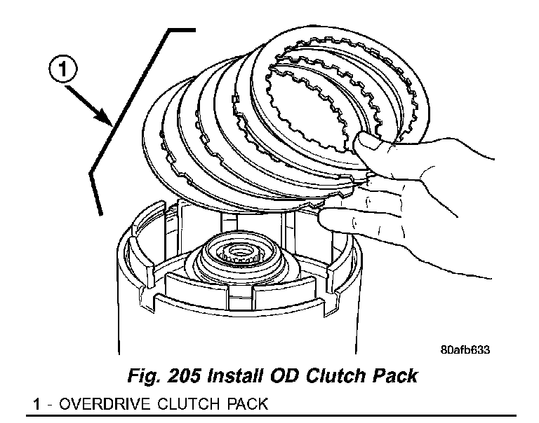 24. Install the OD clutch pack (four fibers/three steels) (1) (Fig. 205).