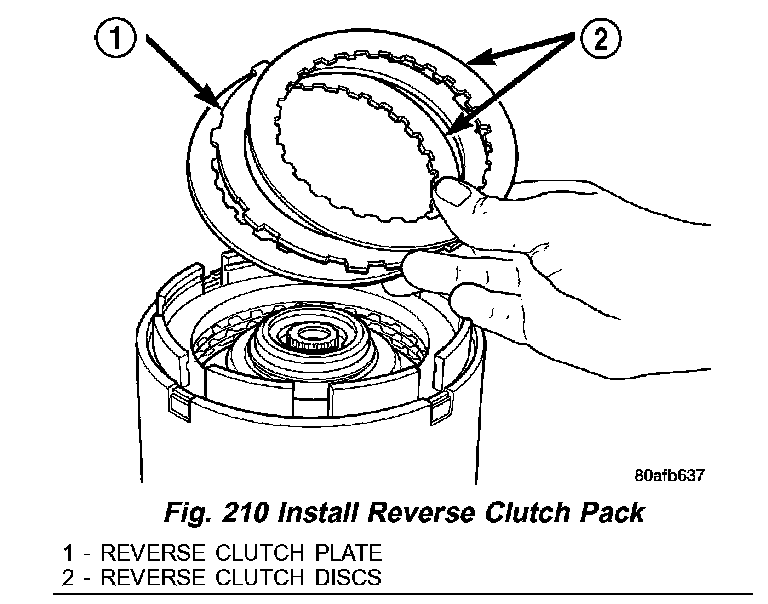 31. Install reverse clutch pack (two fibers/one steel) (1, 2) (Fig. 210).