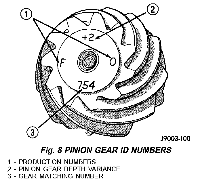 Ring and pinion gears are supplied as matched sets only. The identifying numbers for the ring and pinion gear are etched into the face of each gear (Fig. 8). A plus (+) number, minus (-) number or zero (0) is etched into the face of the pinion gear. This number is the amount (in thousandths of an inch) the depth varies from the standard depth setting of a pinion etched with a (0). The standard depth provides the best gear tooth contact pattern. Refer to Backlash and Contact Pattern for additional information.