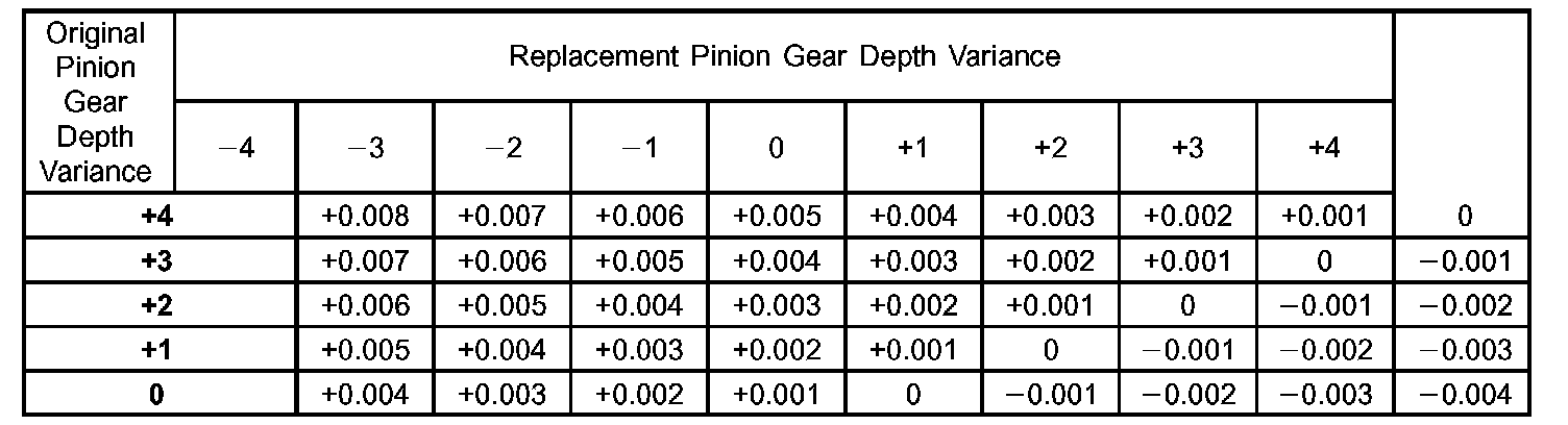 If a new gear set is being installed, note the depth variance etched into both the original and replacement pinion. Add or subtract this number from the thickness of the original depth shim/oil slinger to compensate for the difference in the depth variances. Refer to Depth Variance chart.