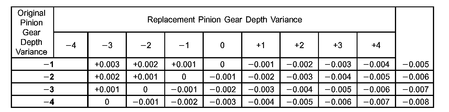 Note the etched number on the face of the pinion gear head (-1, -2, 0, +1, +2, etc.). The numbers represent thousands of an inch deviation from the standard. If the number is negative, add that value to the required thickness of the depth shims. If the number is positive, subtract that value from the thickness of the depth shim. If the number is 0 no change is necessary.