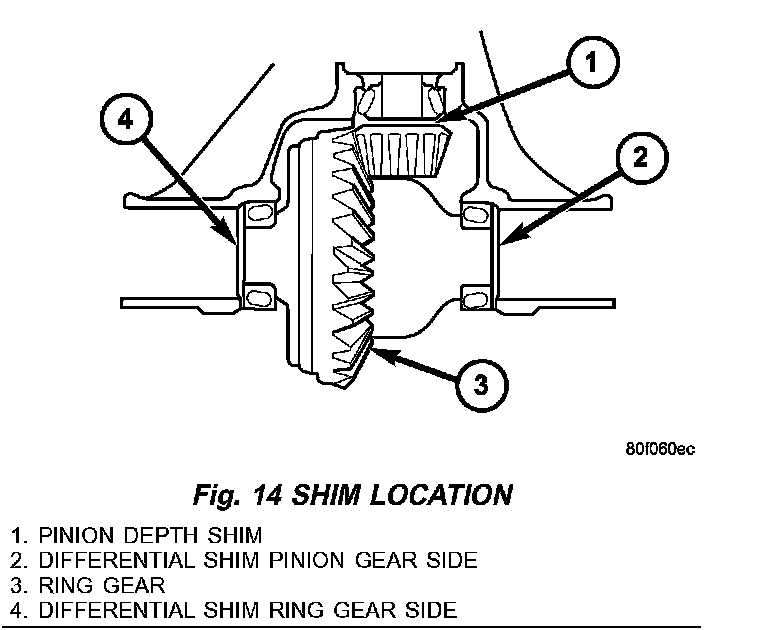 Differential side bearing preload and gear backlash is achieved by selective shims positioned between the differential side bearing cups and the housing. The proper shim thickness is determined using slip-fit Dummy Bearings D-345 in place of the differential side bearings and a Dial Indicator C-3339. Before proceeding with the differential bearing preload and gear backlash measurements, measure the pinion gear depth and prepare the pinion for installation. Establishing proper pinion gear depth is essential to establishing gear backlash and tooth contact patterns. After the overall shim thickness to take up differential side play is measured, the pinion is installed, and the gear backlash shim thickness is measured. The overall shim thickness is the total of the dial indicator reading and the preload specification added together. The gear backlash measurement determines the thickness of the shim used on the ring gear side of the differential case. Subtract the gear backlash shim thickness from the total overall shim thickness and select that amount for the pinion gear side of the differential (Fig. 14). Differential shim measurements are performed with spreader W-129-B removed.