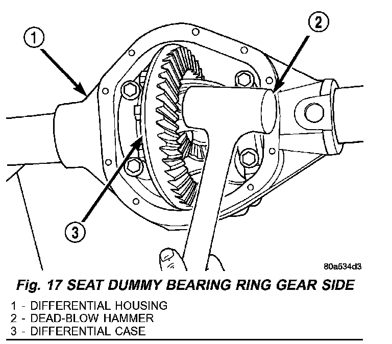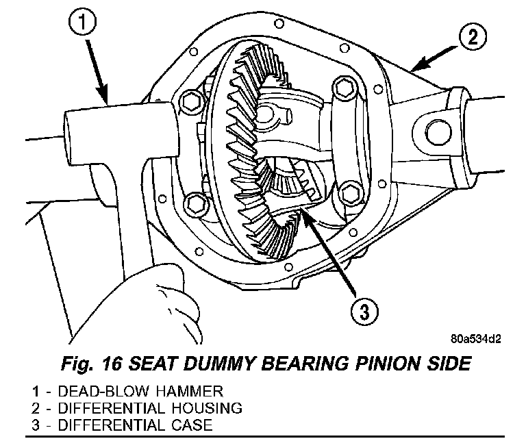 7. With a dead-blow hammer, seat the differential dummy bearings to each side of the housing (Fig. 16) and (Fig. 17).