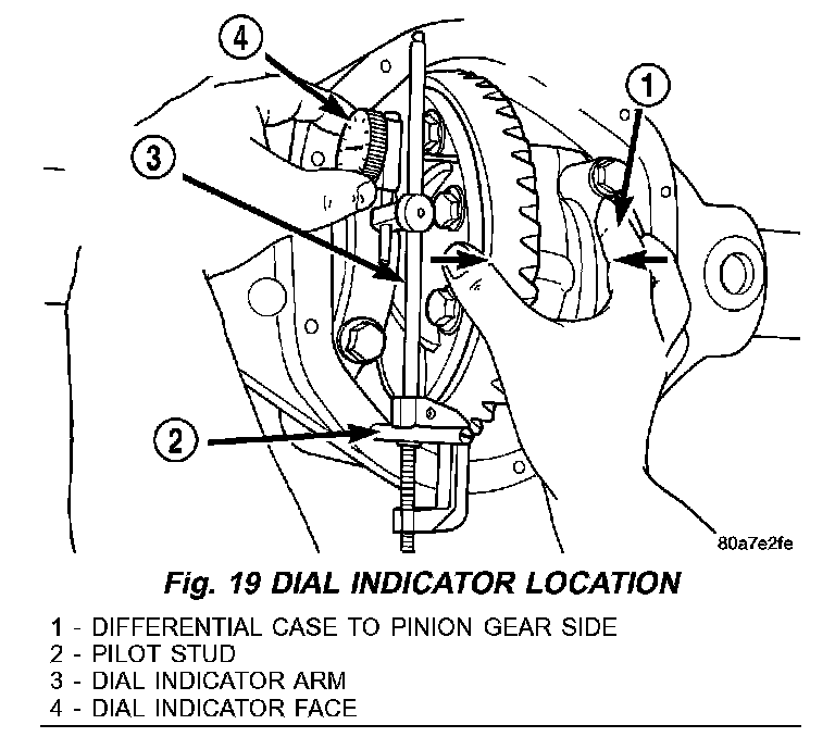 10. Push and hold differential case to pinion gear side of the housing and zero dial indicator (Fig. 19).