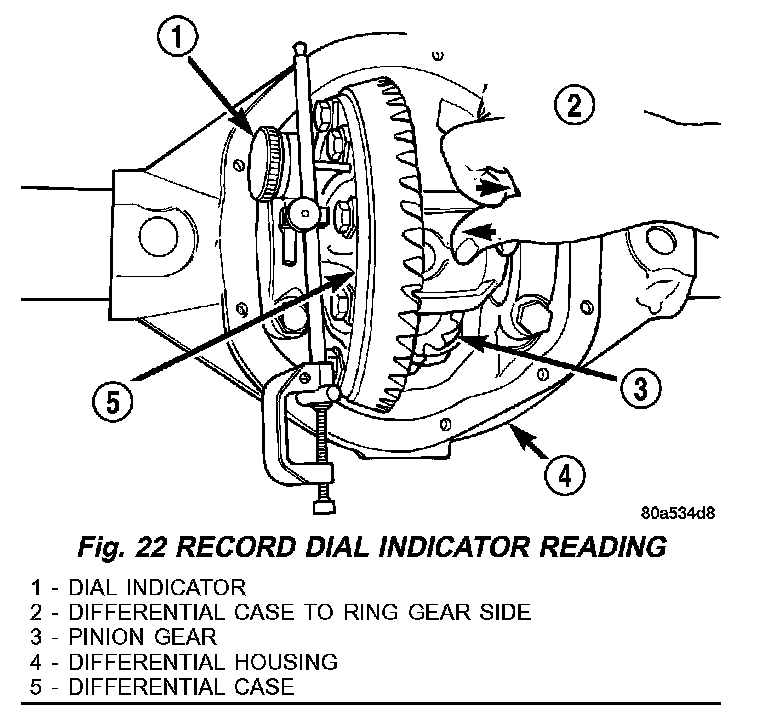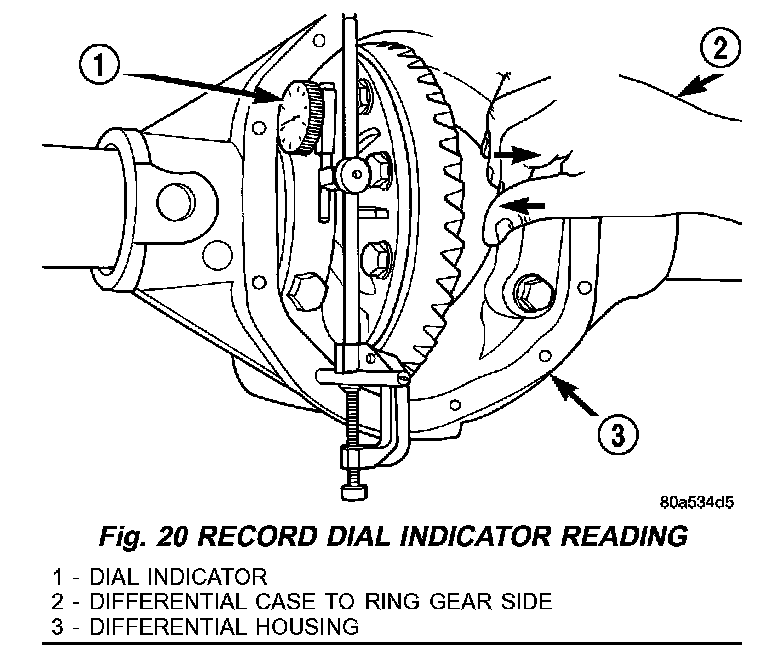 11. Push and hold differential case to ring gear side of the housing and record dial indicator reading (Fig. 20).