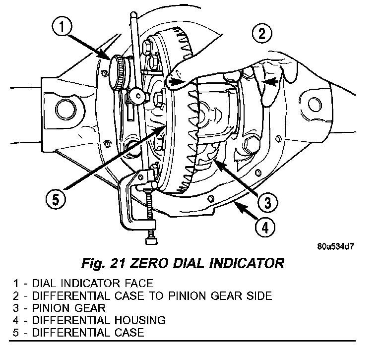 19. Push and hold differential case toward pinion gear and zero dial indicator (Fig. 21).