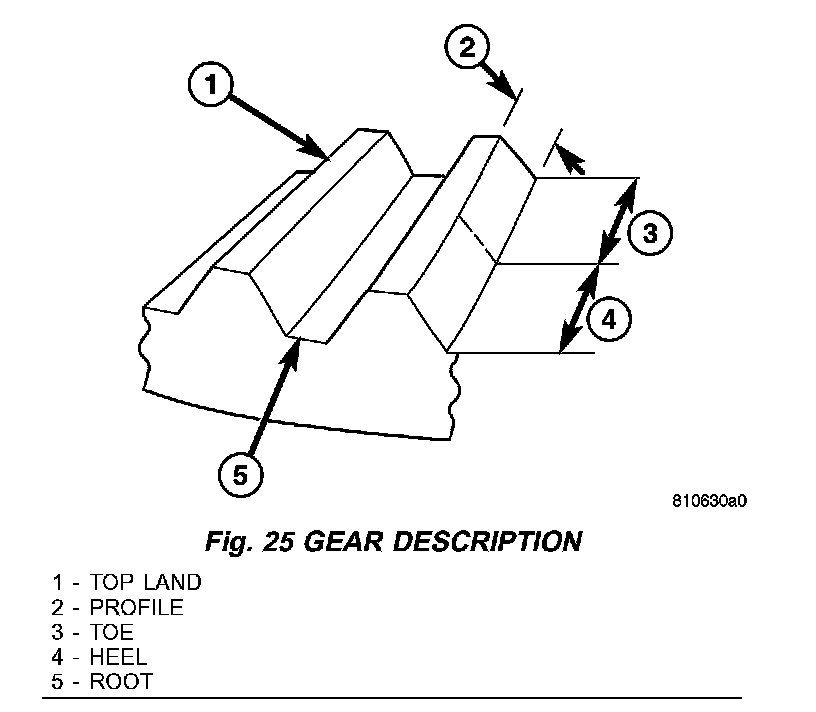 The TOP LAND of the gear tooth is the top surface of the tooth. The PROFILE of the gear tooth is the depth of the tooth. The TOE of the gear is the portion of the tooth surface at the end towards the center. The HEEL of the gear is the portion of the tooth at the outer-end. The ROOT of the gear tooth is the lowest portion of the tooth (Fig. 25).