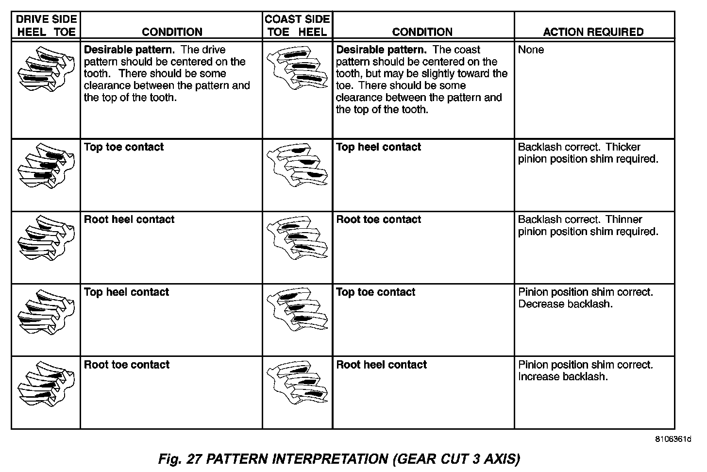 The areas on the ring gear teeth with the greatest degree of contact against the pinion teeth will squeegee the compound to the areas with the least amount of contact. Note and compare patterns on the ring gear teeth to Gear Tooth Contact Patterns chart (Fig. 26) and (Fig. 27) and adjust pinion depth and gear backlash as necessary.
