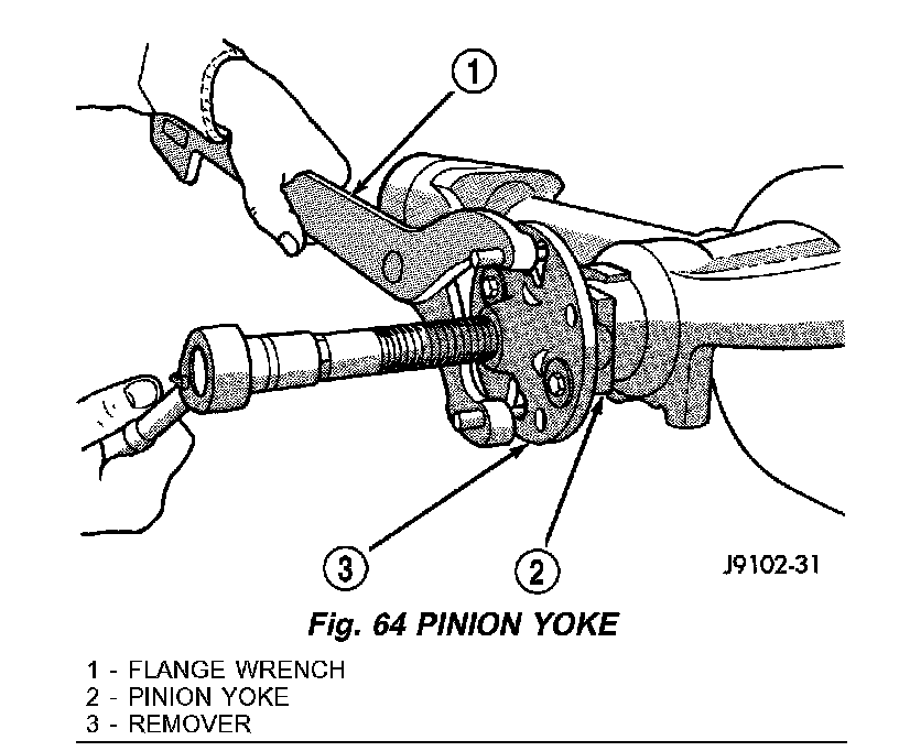 6. Remove pinion yoke with Remover C-452 and Flange Wrench C-3281 (Fig. 64).