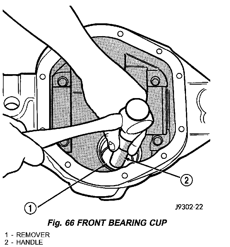8. Remove front pinion bearing cup, bearing, oil slinger and pinion seal with Remover C-4345 and Handle C-4171 (Fig. 66).
