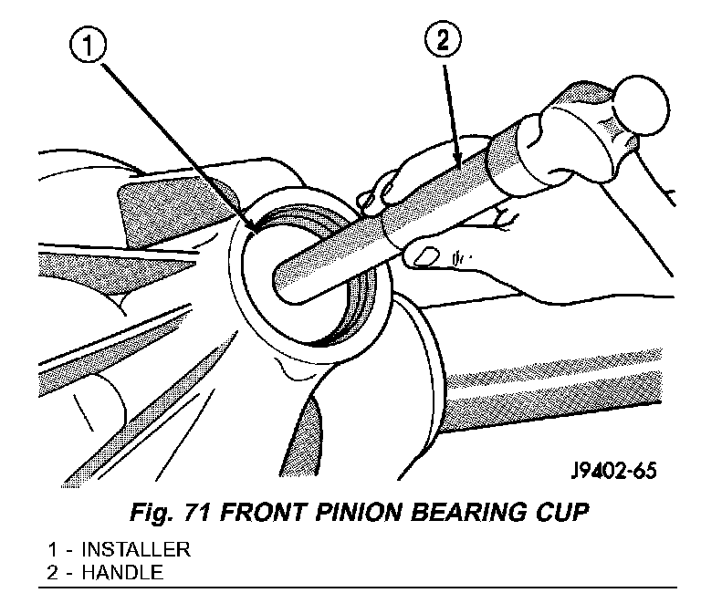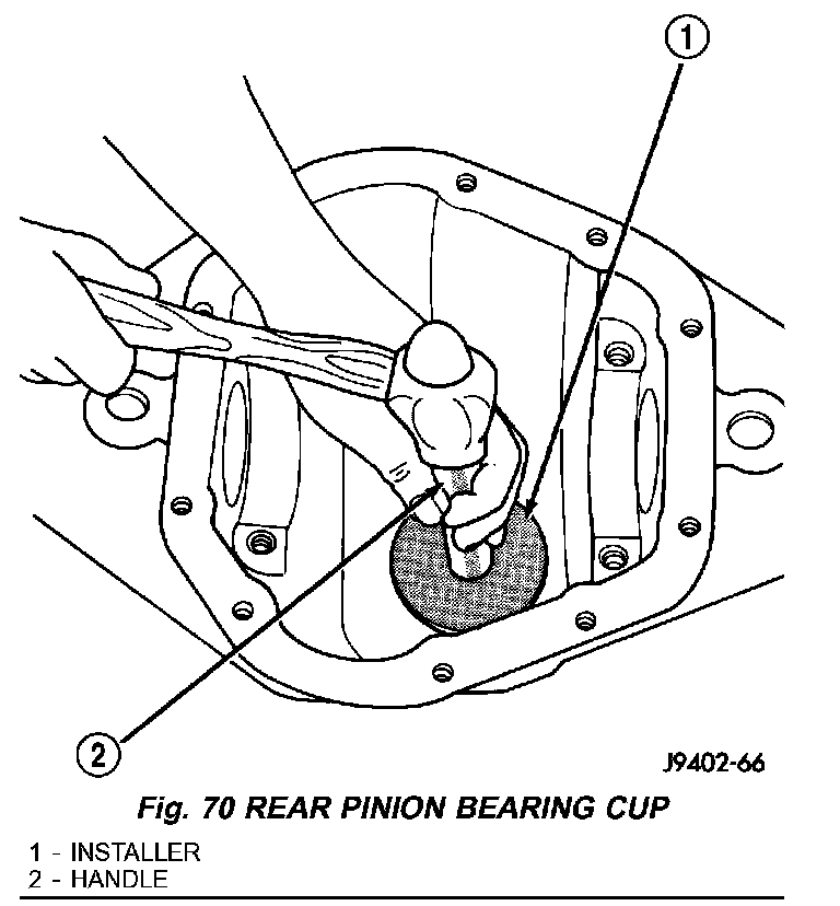 1. Apply Mopar Door Ease or equivalent lubricant to outside surface of the pinion bearing cups. Install rear bearing cup with Installer D-146 and Driver Handle C-4171 (Fig. 70) and verify cup is seated.