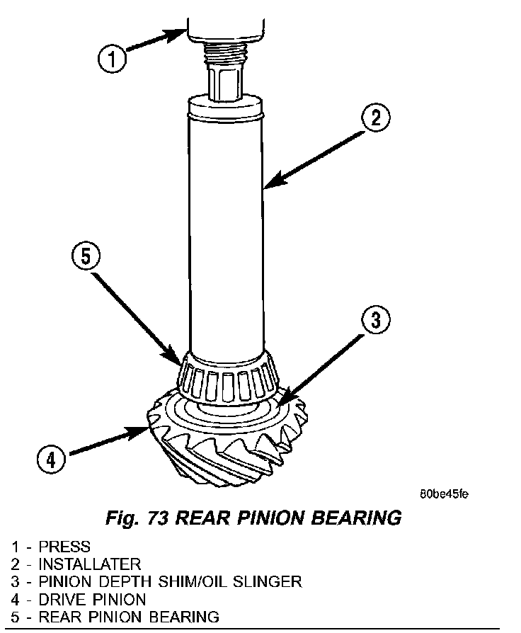 NOTE: A pinion depth shim/oil slinger is placed between the rear pinion bearing cone and the pinion head to achieve proper ring gear and pinion mesh. If ring gear and pinion are reused, the pinion depth shim/oil slinger should not require replacement. Refer to Adjustment (Pinion Gear Depth) to select the proper thickness shim/oil slinger if ring and pinion gears are replaced.