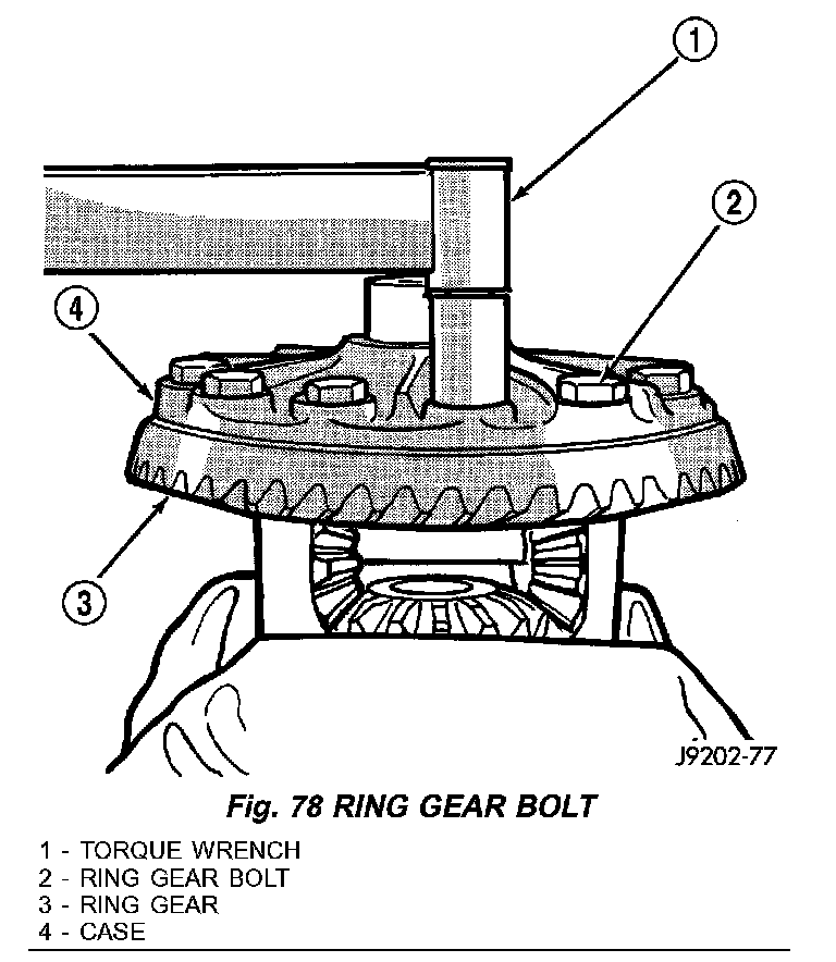 12. Invert the differential case in the vise and install new ring gear bolts and alternately tighten to 108 Nm (80 ft. lbs.) (Fig. 78).