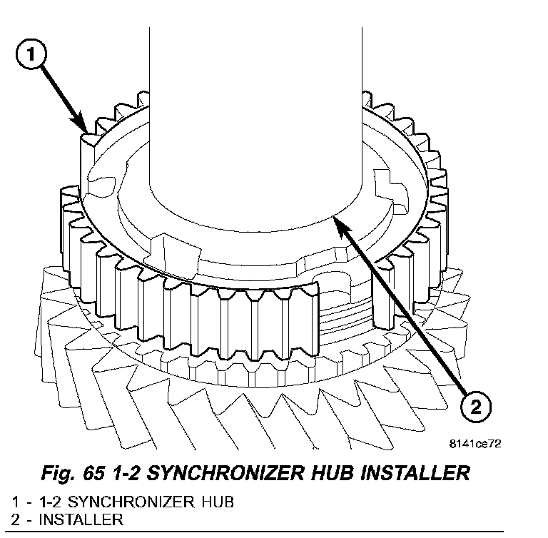 7. Install 1-2 synchronizer hub (1) (Fig. 65) with Installer 8228 (2) and a press. Align hub detent openings with synchronizer rings.