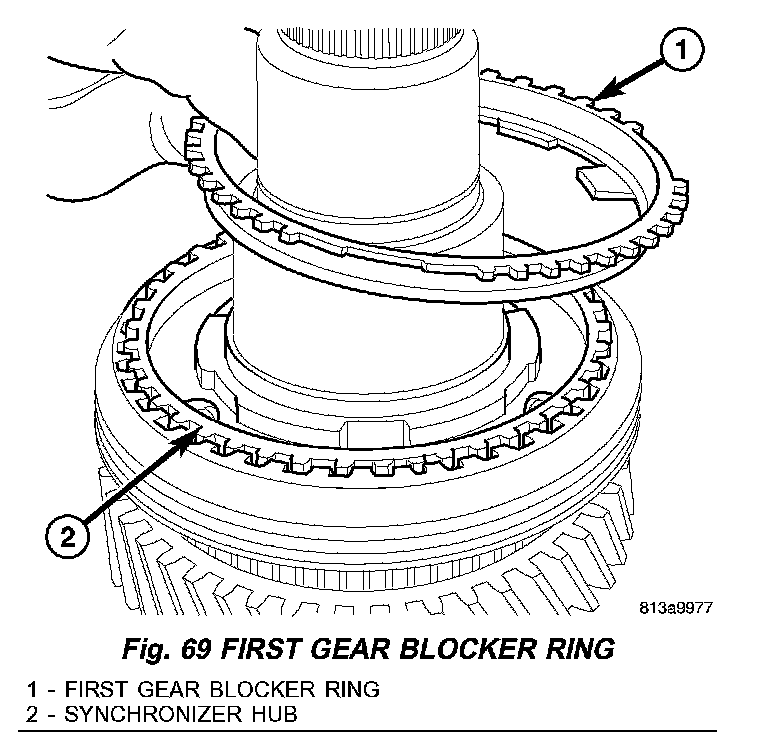 11. Install first gear blocker ring (1) (Fig. 69) into synchronizer hub (2).