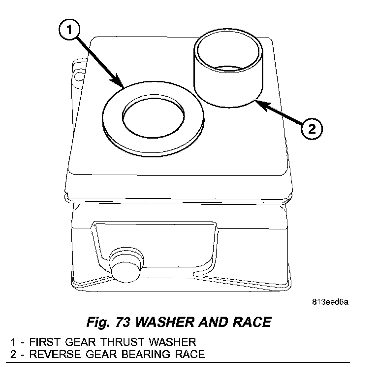 15. Heat first gear thrust washer (1) (Fig. 73) and reverse gear bearing race (2) with bearing heater.