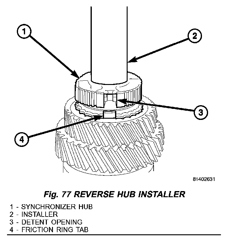 19. Install reverse gear synchronizer hub (1) on mainshaft with Installer W-262 (2) and a press. Align hub detent opening (3) with friction ring (4) lug (Fig. 77).