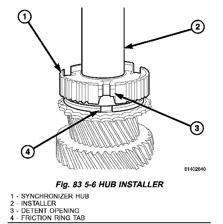 26. Install 5-6 synchronizer hub (1) with Installer W-262 (2). Align hub detent opening (3) with friction ring lugs (4) and press hub on mainshaft (Fig. 83).